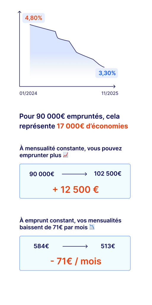 Illustration concrète avec un financement de 250 000 € : cette évolution favorable vous fait économiser 50 000 € sur l’ensemble du remboursement. Vous pouvez exploiter cet avantage de deux manières complémentaires :