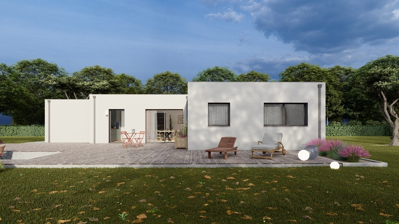 Maison de plain pied, BAS CARBONE, en ossature bois fabriquée à L'Hermitage (35) de 100m², 4 chambres, une salle d'eau avec WC indépendant. Un garage est également accolé à la construction.