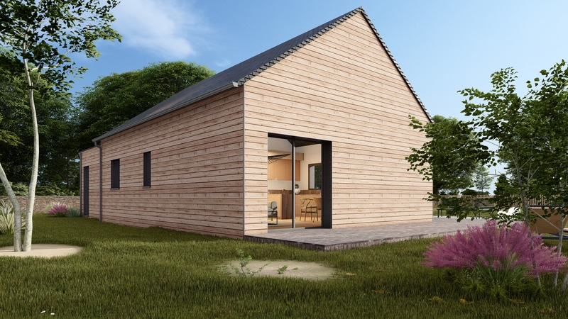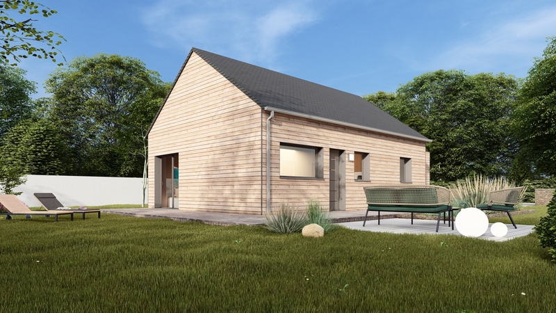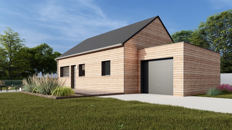 Maison de plain pied, BAS CARBONE, en ossature bois fabriquée à L'Hermitage (35) de 60m², deux chambres, une salle d'eau avec WC indépendant. Un garage est également accolé à la construction.