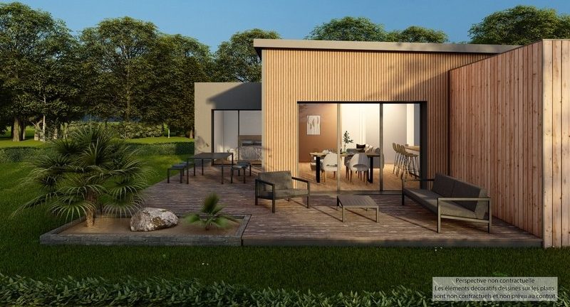 Ce plain-pied Trecobois se distingue par son architecture contemporaine avec sa toiture de type toit plat et ses jeux de bardage qui lui apportent une touche d'élégance et de modernité.