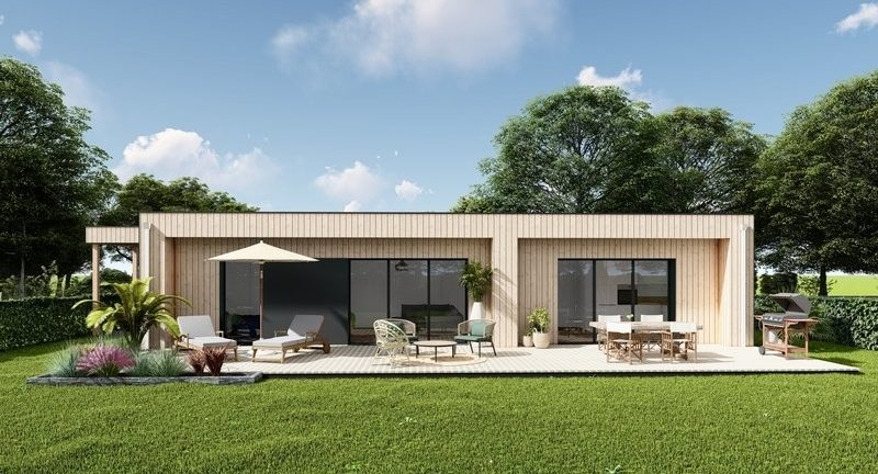 N'attendez plus et venez nous rencontrer pour échanger sur votre projet ! Exemple d'une maison de plain-pied Trecobois de 106 m² avec pièce de vie d'environ 45 m², trois chambres, deux salles d'eau, WC séparés, cellier et carport.