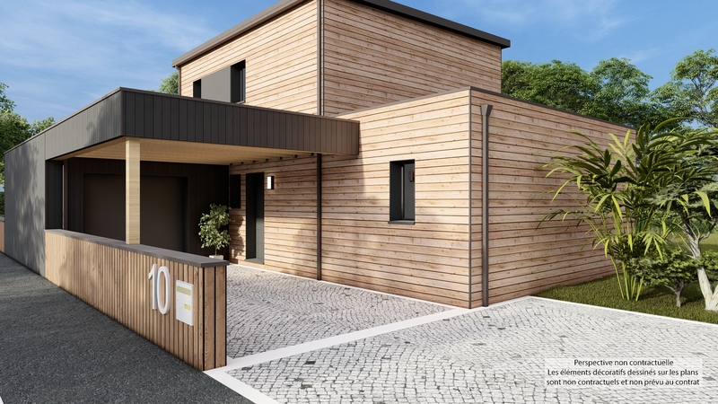 En vente, une maison moderne de 110m² avec une architecture de type étage. Cette propriété se distingue par son design contemporain, caractérisé par un toit plat, qui offre un look épuré et minimaliste.