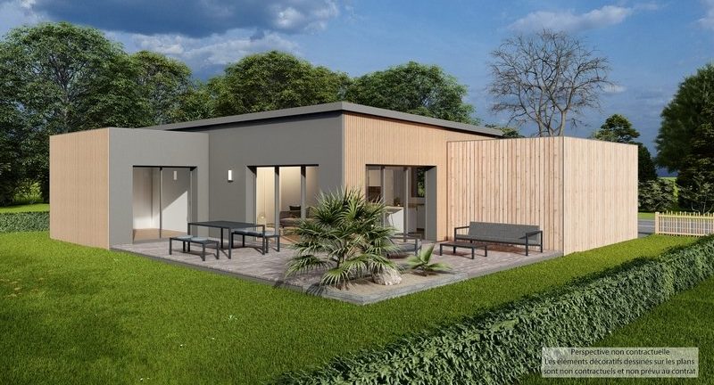 Une maison en Bois de plain-pied d'une superficie de 60 m², une architecture moderne avec son toit plat, symbole d'élégance et de simplicité. Cette maison offre un espace de vie optimisé et fonctionnel, composé de trois pièces lumineuses et accueillantes.