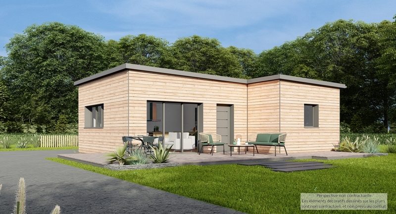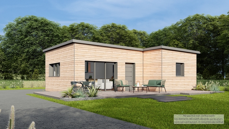 En vente : une maison de plain-pied d'une superficie de 59 m². Cette demeure compacte mais bien conçue offre un espace de vie optimisé et fonctionnel. La maison se distingue par son architecture moderne, avec une toiture de type toit plat qui lui confère une allure contemporaine.