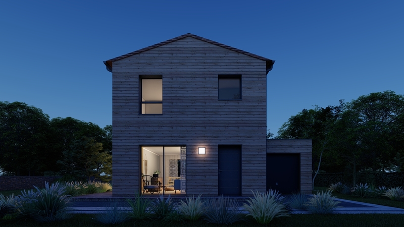 Construite avec une ossature bois, cette maison est pensée pour un confort optimal et une excellente performance énergétique. La toiture en tuiles et le bardage extérieur lui confèrent un style moderne et chaleureux.