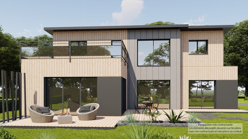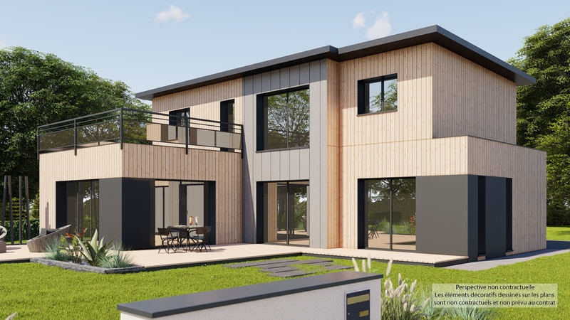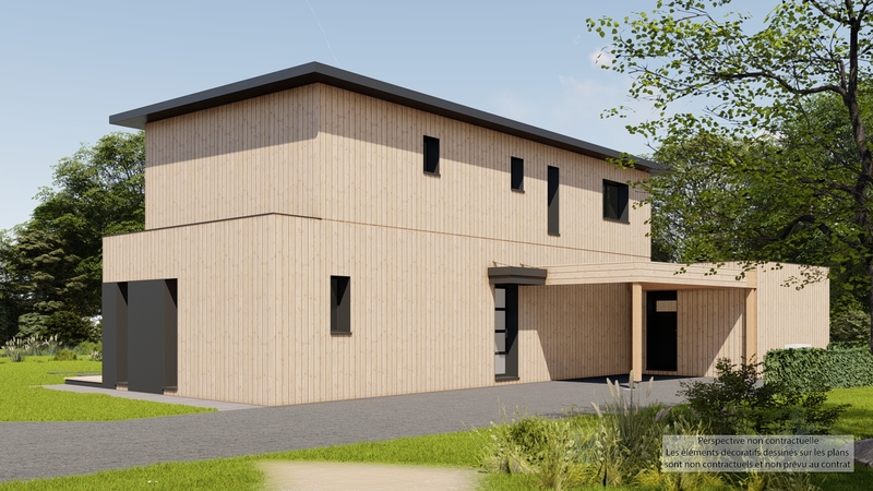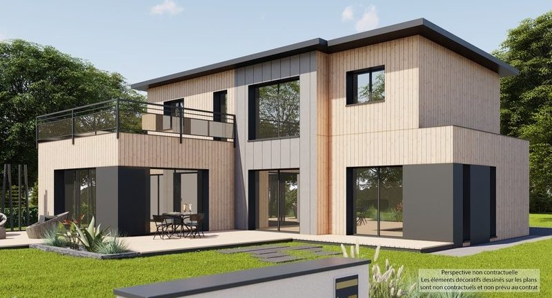 L'exemple de cette grande maison bois de 145m², construite sur deux niveaux, située dans un quartier résidentiel prisé. Cette propriété se distingue par son architecture moderne, avec une toiture de type toit plat qui lui confère une allure contemporaine et élégante.