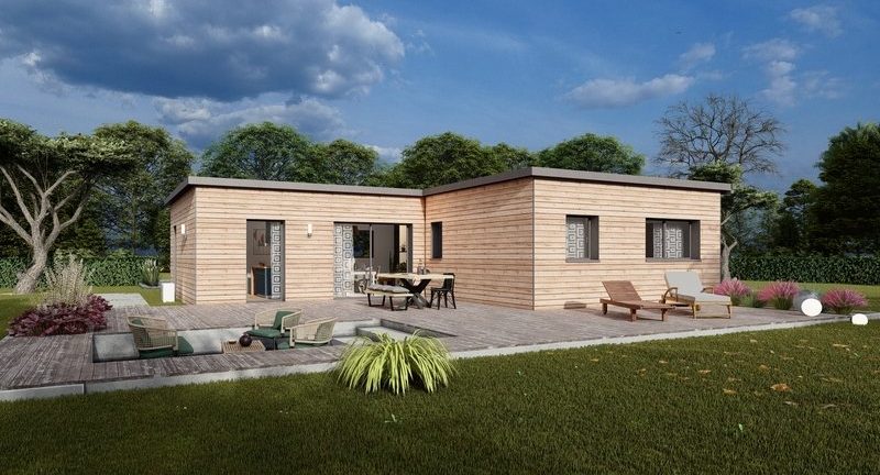 Nous vous présentons une charmante maison bois de plain-pied de 99m², un bien immobilier qui allie confort et esthétique. Cette résidence se distingue par son architecture moderne avec une toiture de type toit plat, qui lui confère un design contemporain et épuré.