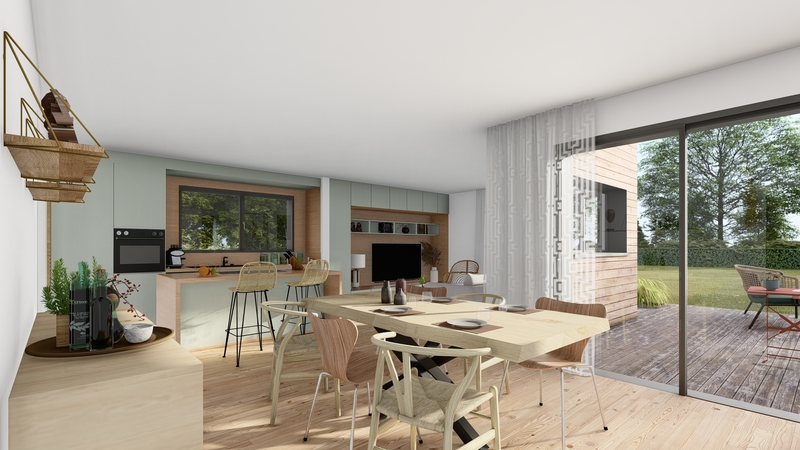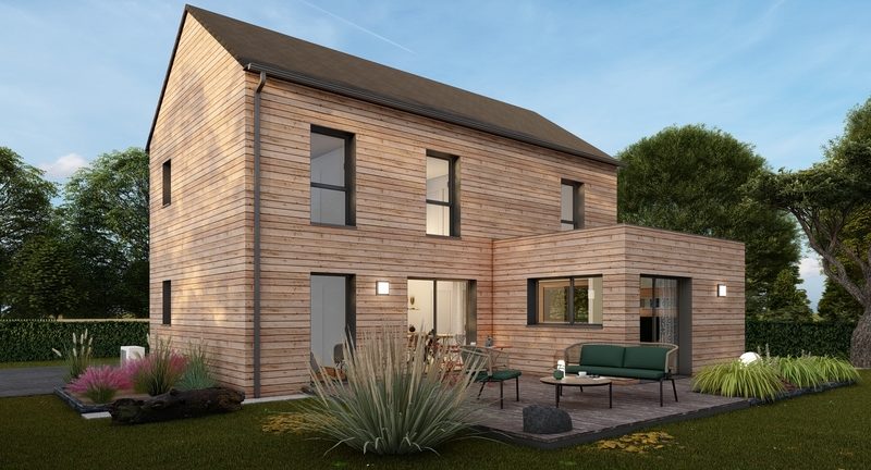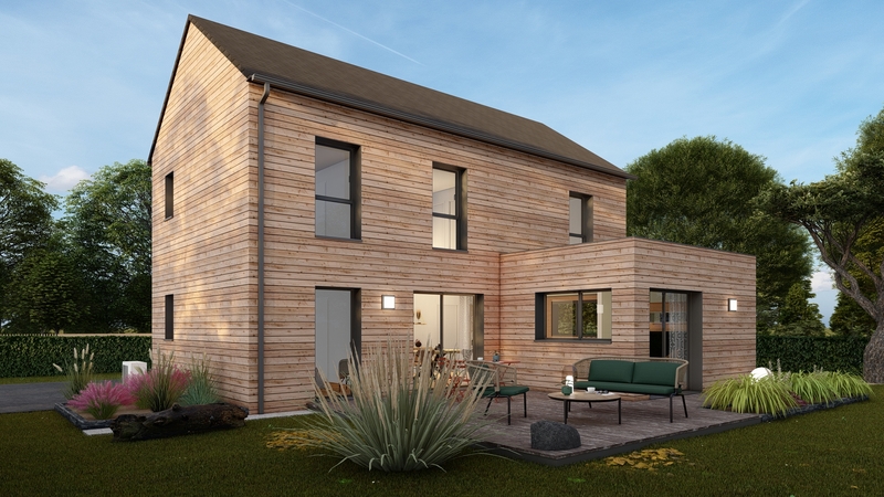 Maison ossature bois Bardage Douglas naturel, maison étage de 126m2 toiture ardoisée, comprenant cuisine ouverte sur séjour, 4 chambres, 2 salles d'eau, cellier.