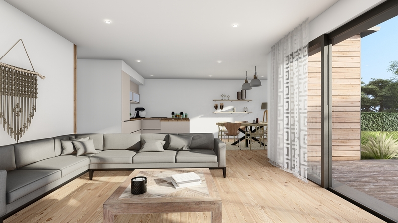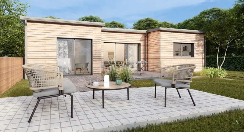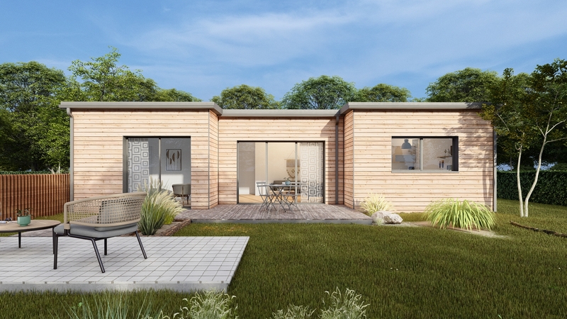 Maison ossature bois, bardage Douglas naturel, plain pied de 105m2 comprenant cuisine ouverte sur séjour, 3 chambres dont 1 suite parentale, 2 salles d'eau, cellier, toit plat.