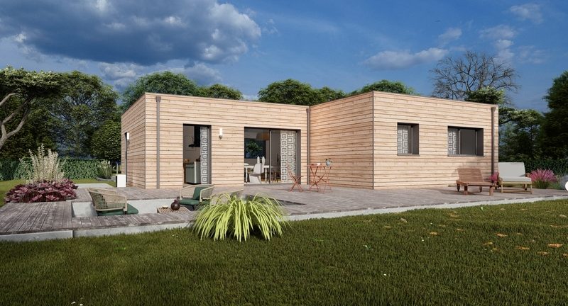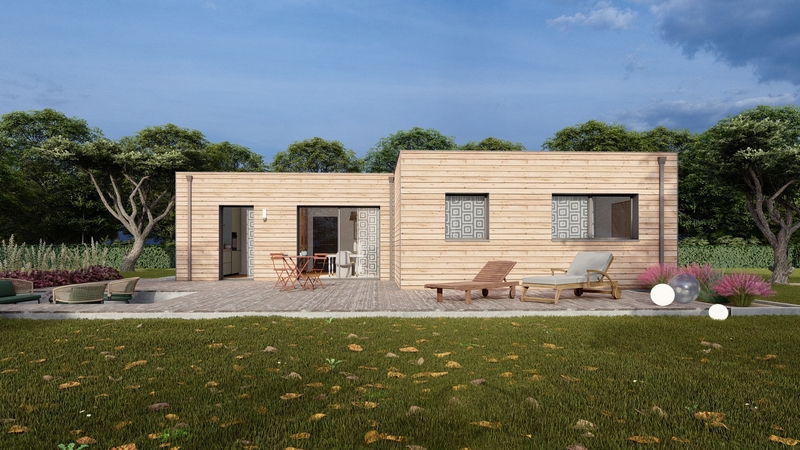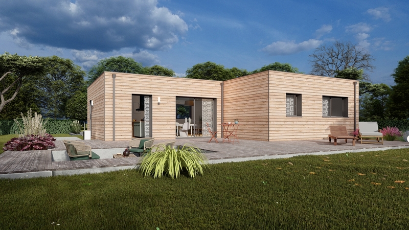 Maison ossature bois bardage douglas naturel, plain pied de 90m2 comprenant cuisine ouverte sur séjour, 3 chambres, salle d'eau, cellier. Toit plat.