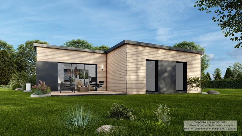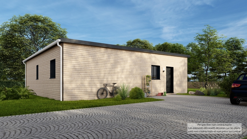 En vente, une maison de plain-pied de 80 m² avec une conception moderne et un toit plat, offrant une esthétique contemporaine. Cette demeure comprend trois chambres spacieuses, idéales pour une famille, et une pièce supplémentaire qui peut être aménagée selon les besoins : bureau, salle de jeux ou salle à manger.