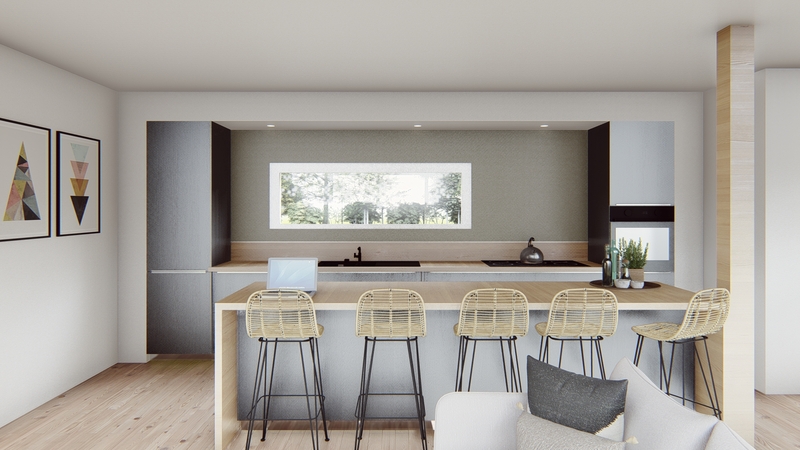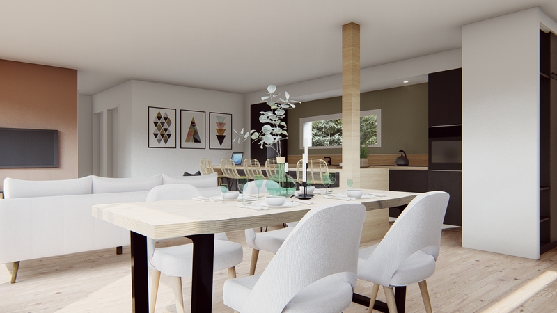 Idéalement conçue sur une surface de 92m², cette habitation se distingue par son architecture moderne avec un élégant toit plat, dans l'esprit des réalisations Trecobois. Son charme réside dans son bardage bois extérieur, qui lui confère une chaleur et une intégration naturelle, tout en assurant une excellente isolation.