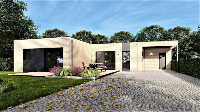 Dans un cadre résidentiel, découvrez cette maison de plain-pied de 96m², une architecture moderne avec toit plat, offrant un espace de vie harmonieux et fonctionnel.