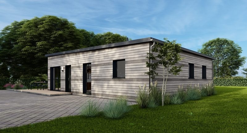 En vente, une maison de plain-pied de 80m², conçue de manière à maximiser l'espace et la fonctionnalité. Le design moderne de cette demeure est accentué par une toiture plate, ajoutant une touche d'élégance et de contemporain à l'ensemble de la propriété.