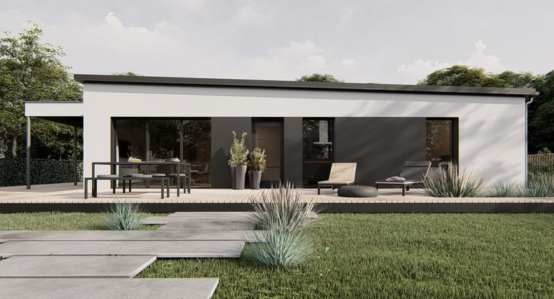 En vente, une maison de type plain-pied, d'une superficie de 95m². Cette demeure de 4 pièces, à l'architecture moderne et au design soigné, offre un confort de vie optimal. Sa toiture de type toit plat lui confère une allure contemporaine et épurée.