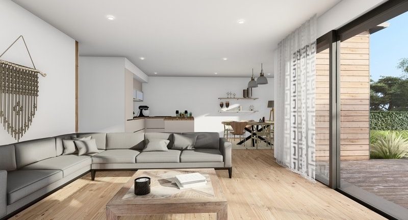 L'espace de vie principal est un open space qui combine une cuisine moderne entièrement équipée, une salle à manger et un salon. Cette disposition offre un espace de vie commun où la famille peut se rassembler et passer du temps ensemble. Les grandes fenêtres laissent entrer beaucoup de lumière naturelle, créant une atmosphère chaleureuse et accueillante.