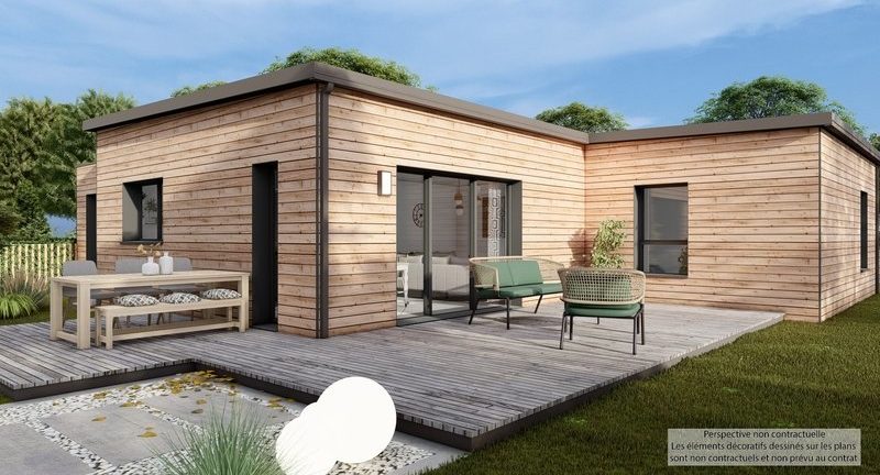 Maison contemporaine de plain-pied écologique très basse consommation à ossature bois et bardage bois d'une surface habitable de 86 m². Composée d'une grande pièce de vie lumineuse, cuisine US, 3 chambres, garage accolé de 20 m². Belles prestations: menuiseires gris RAL 2900, isolation renforcée, PAC air-air HITACHI, 6 panneaux photovoltaïques LONGI, domotique, carrelage imitation parquet.