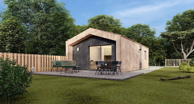 Maison de plain-pied TINYDO écologique bas carbone à ossature bois et bardage bois. D'une surface habitable de 41 m² avec un aménagement optimisé, elle est composée d'une pièce de vie lumineuse avec espace cuisine, 2 chambre. salle d'eau. Carrelage sur toute la surface. Encadrement et appui des menuiseries en aluminium. Parfait pour personne seule ou investisseur.