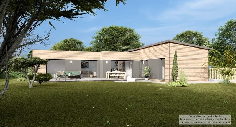 Maison contemporaine de plain-pied écologique bas carbone et très basse consommation d'énergie à ossature bois et bardage bois. D'une surface habitable de 104,82 m², elle est composée d'une grande pièce de vie lumineuse avec cuisine ouverte, 3 chambres dont une suite parentale située à l'opposé des deux autres, SDB, cellier, WC suspendu. Belles prestations comprenant menuiseires gris RAL 2900, isolation renforcée, PAC air-eau PANASONIC Génération L avec plancher chauffant / rafraîchissant, ventilation Healtbox 3.0 Hydro, 8 panneaux photovoltaïques LONGI avec revente, domotique, carrelage 60x60 ou imitation parquet.