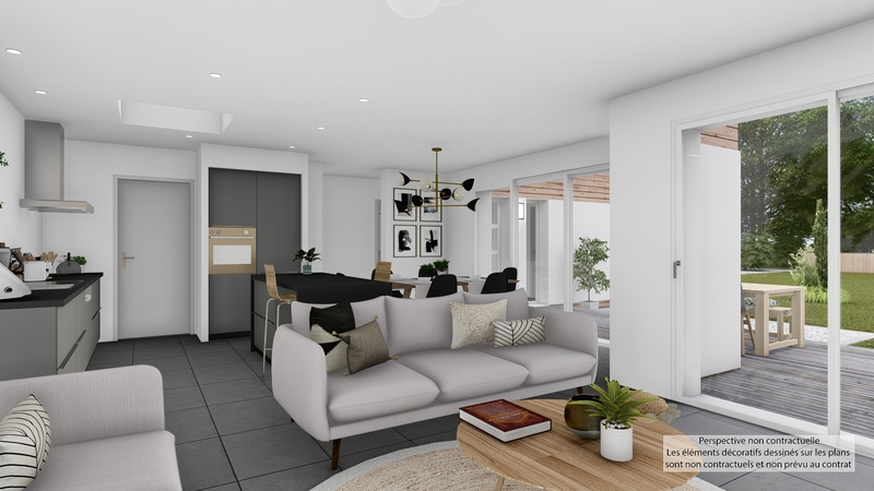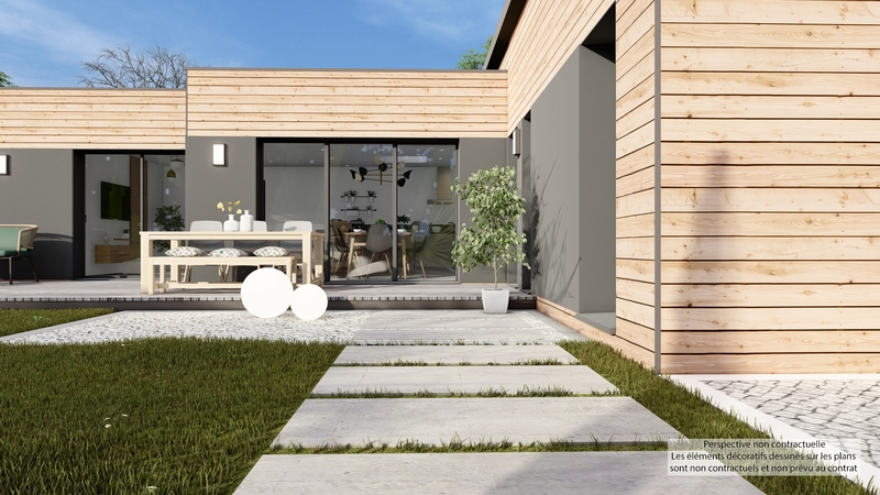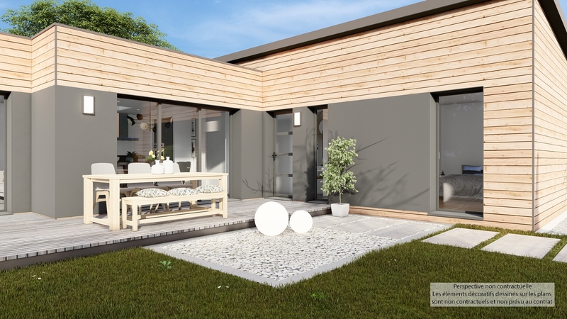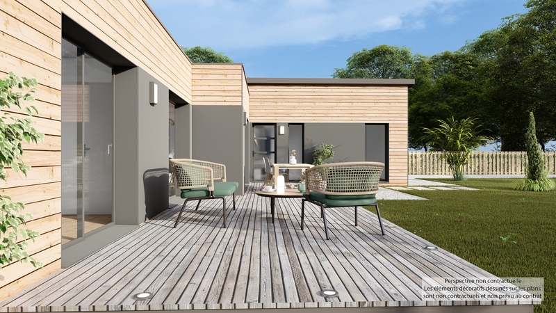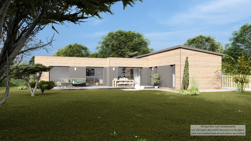 Maison contemporaine de plain-pied écologique bas carbone et très basse consommation d'énergie à ossature bois et bardage bois. D'une surface habitable de 104,82 m², elle est composée d'une grande pièce de vie lumineuse avec cuisine ouverte, 3 chambres dont une suite parentale située à l'opposé des deux autres, SDB, cellier, WC suspendu. Belles prestations comprenant menuiseires gris RAL 2900, isolation renforcée, PAC air-eau PANASONIC Génération L avec plancher chauffant / rafraîchissant, ventilation Healtbox 3.0 Hydro, 8 panneaux photovoltaïques LONGI avec revente, domotique, carrelage 60x60 ou imitation parquet.