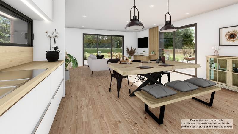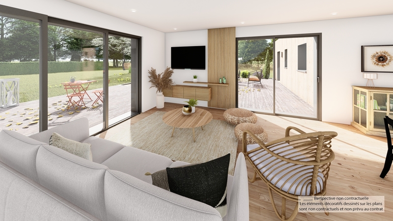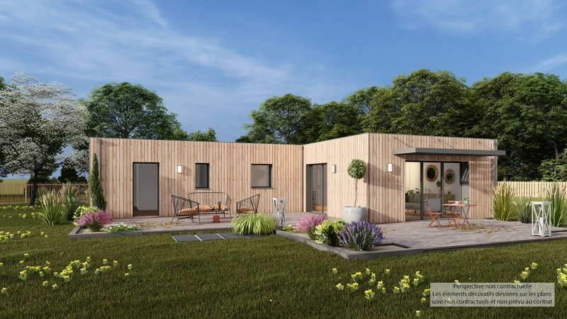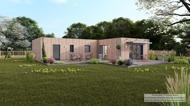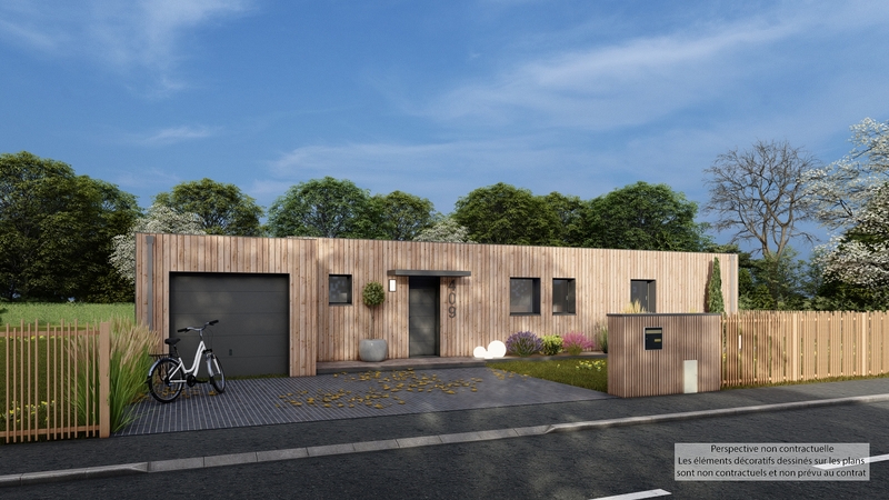 Maison contemporaine de plain-pied écologique bas carbone et très basse consommation d'énergie à ossature bois et bardage bois. D'une surface habitable de 109 m², elle est composée d'une grande pièce de vie lumineuse avec cuisine US, 3 chambres dont une suite parentale, bureau, cellier et garage accolé. Belles prestations comprenant menuiseires gris RAL 2900, isolation renforcée, PAC air-air HITACHI tripe C, ventilation Heabox 3.0 Hydro, 8 panneaux photovoltaïques LONGI avec revente, domotique, carrelage 60x60 et imitation parquet.
