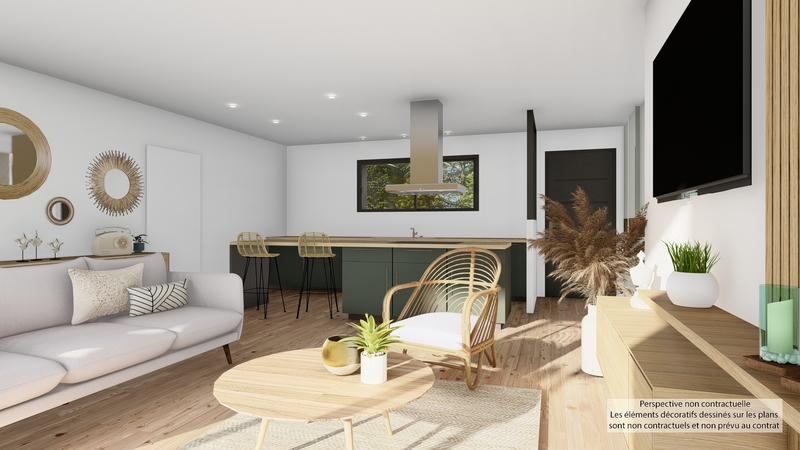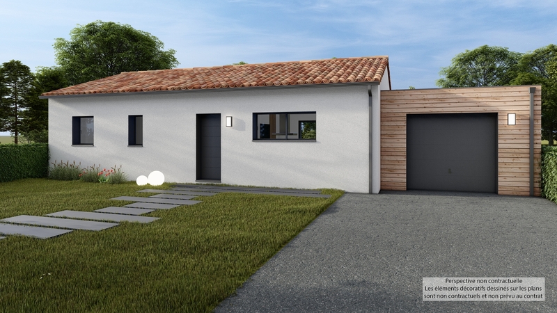 Maison contemporaine de plain-pied, écologique bas carbone et très basse consommation d'énergie à ossature bois avec partie maison enduite et garage bardage bois Douglas naturel. D'une surface habitable de 82 m², elle est composée d'une grande pièce de vie lumineuse avec cuisine US, d'un WC, de 3 belles chambres, d'une SDB et d'un garage de 20 m². Belles prestations comprenant menuiseires gris RAL 2900, isolation renforcée en fibre de bois, pompe à chaleur PANASONIC génération L avec plancher chauffant / rafraïchissant, ventilation Healthbox 3.0 Hydro, 6 panneaux photovoltaïques LONGI avec revente, domotique, carrelage 60x60 et imitation parquet.