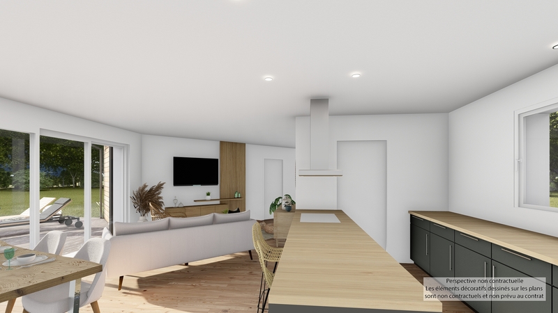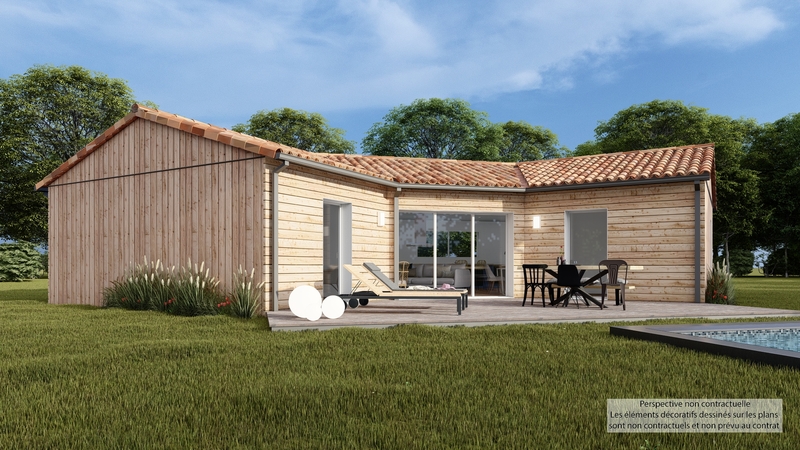 Maison contemporaine de plain-pied, écologique bas carbone et très basse consommation d'énergie à ossature bois et bardage bois. D'une surface habitable de 104 m², elle est composée d'une grande pièce de vie centrale lumineuse avec cuisine US, d'un cellier, d'une entrée avec penderie, WC. D'un côté une chambre parentale avec dressing et salle d'eau, et à l'opposé 2 autres chambres, SDB avec WC d'appoint. Belles prestations comprenant isolation renforcée, pompe à chaleur PANASONIC génération L avec plancher chauffant / rafraîchissant, ventilation Healthbox 3.0 Hydro, 8 panneaux photovoltaïques LONGI avec revente, domotique, carrelage 60x60 et imitation parquet.