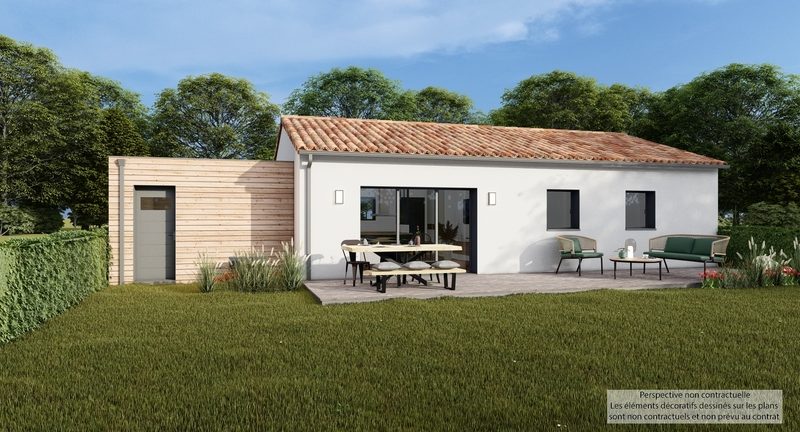 Maison contemporaine de plain-pied, écologique bas carbone et très basse consommation d'énergie à ossature bois avec partie maison enduite et garage bardage bois Douglas naturel. D'une surface habitable de 82 m², elle est composée d'une grande pièce de vie lumineuse avec cuisine US, d'un WC, de 3 belles chambres, d'une SDB et d'un garage de 20 m². Belles prestations comprenant menuiseires gris RAL 2900, isolation renforcée en fibre de bois, pompe à chaleur PANASONIC génération L avec plancher chauffant / rafraïchissant, ventilation Healthbox 3.0 Hydro, 6 panneaux photovoltaïques LONGI avec revente, domotique, carrelage 60x60 et imitation parquet.