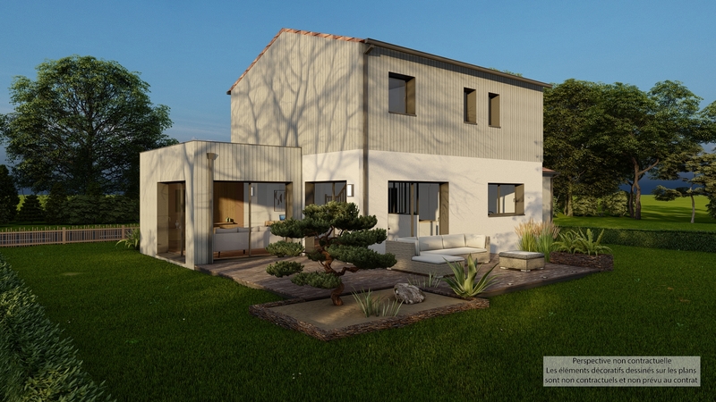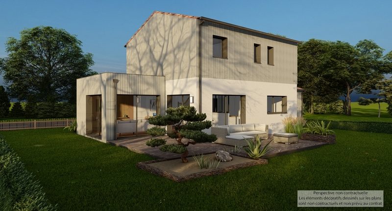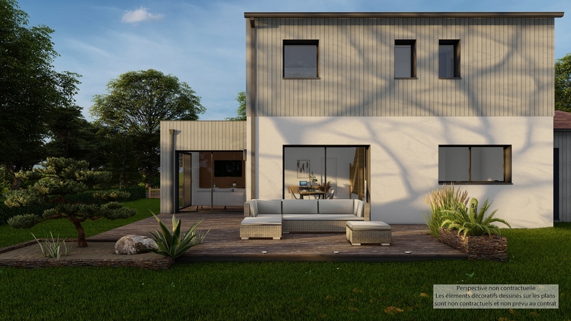 Maison contemporaine écologique bas carbone et très basse consommation d'énergie à ossature bois et bardage bois. D'une surface habitable de 121,30 m², elle est composée au RDC d'une grande pièce de vie lumineuse avec cuisine ouverte, cellier, WC suspendu, chambre parentale avec SDE privative, et à l'étage 3 chambres, SDB, WC suspendu indépendant. Belles prestations comprenant menuiseires gris RAL 2900, isolation renforcée, PAC Air-eau PANASONIC Génération L avec plancher chauffant / rafraîchissant, ventilation Healtbox 3.0 Hydro, 8 panneaux photovoltaïques LONGI avec revente, domotique, carrelage 60x60 et imitation parquet.