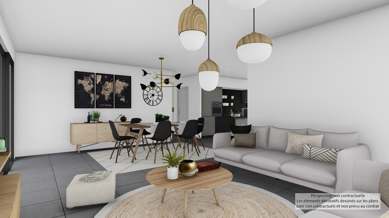 Maison design de plain-pied, écologique bas carbone et très basse consommation d'énergie à ossature bois et bardage bois. D'une surface habitable de 120 m², elle est composée d'une vaste pièce de vie lumineuse avec cuisine US, d'un cellier, d'une entrée avec penderie, de 2 WC suspendus (à l'entrée et en partie nuit), de 3 chambres dont une suite parentale à l'opposé des deux autres avec dressing et SDE, d'un espace bureau/multimédia, d'une SDB, d'un carport et d'un garage. Belles prestations comprenant menuiseires gris RAL 2900, PAC PANASONIC Génération L avec plancher chauffant / rafraïchissant, ventilation Healthbox 3.0 Hydro, 8 panneaux photovoltaïques LONGI avec revente, domotique, carrelage 60x60 et imitation parquet.
