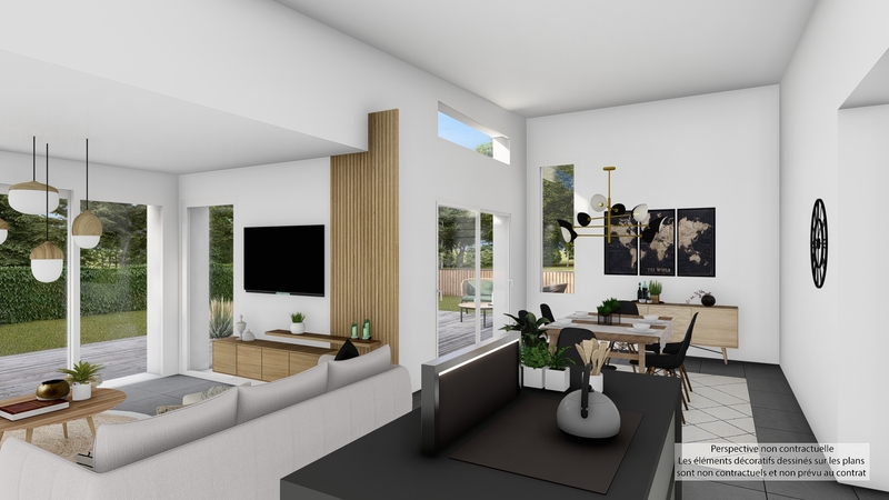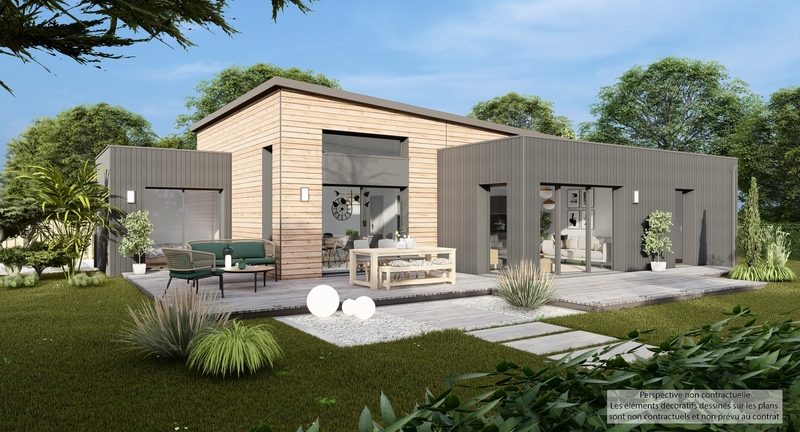 Maison design de plain-pied, écologique bas carbone et très basse consommation d'énergie à ossature bois et bardage bois. D'une surface habitable de 120,56 m², elle est composée d'une vaste pièce de vie lumineuse et déplafonnée avec cuisine US, d'un cellier, d'une entrée avec penderie, de 2 WC suspendus (à l'entrée et en partie nuit), de 3 chambres dont une suite parentale à l'opposé des deux autres avec dressing et SDE, d'un espace bureau/multimédia, d'une SDB, d'un carport et d'un garage. Belles prestations comprenant menuiseires gris RAL 2900, PAC PANASONIC Génération L avec plancher chauffant / rafraïchissant, ventilation Healthbox 3.0 Hydro, 8 panneaux photovoltaïques LONGI avec revente, domotique, carrelage 60x60 et imitation parquet.