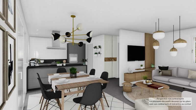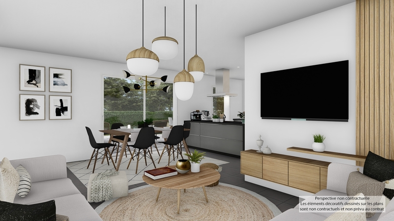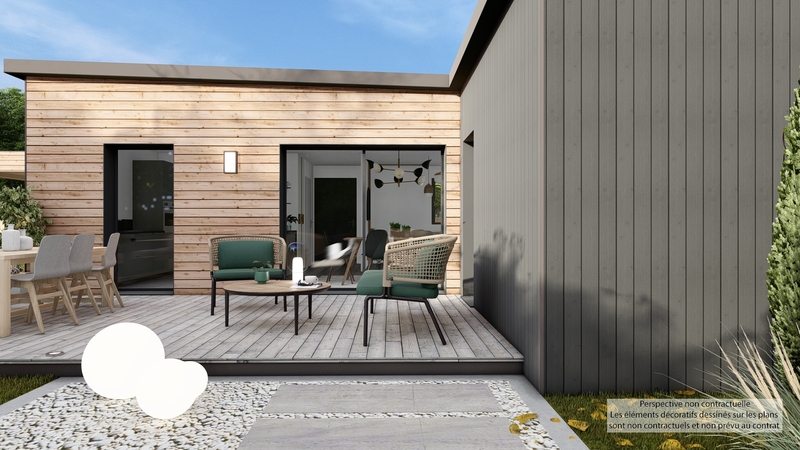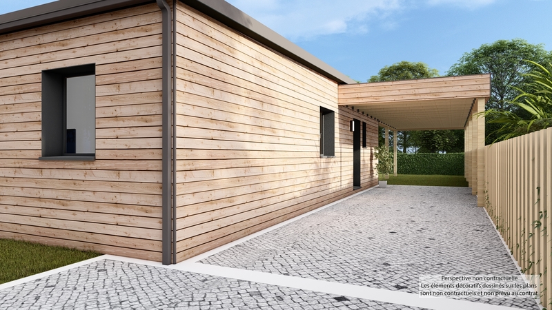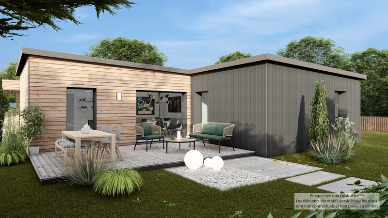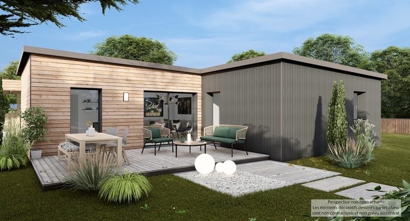 Maison design de plain-pied, écologique bas carbone et très basse consommation d'énergie à ossature bois et bardage bois. D'une surface habitable de 92 m², elle est composée d'une vaste pièce de vie lumineuse avec cuisine US, d'un cellier, d'une entrée avec penderie et wc, de 3 chambres, salle de bains. Belles prestations comprenant menuiseires gris RAL 2900, PAC Air-air HITACHI Triple C, ventilation Healthbox 3.0 Hydro, 6 panneaux photovoltaïques avec revente, domotique, carrelage 60x60 et imitation parquet.
