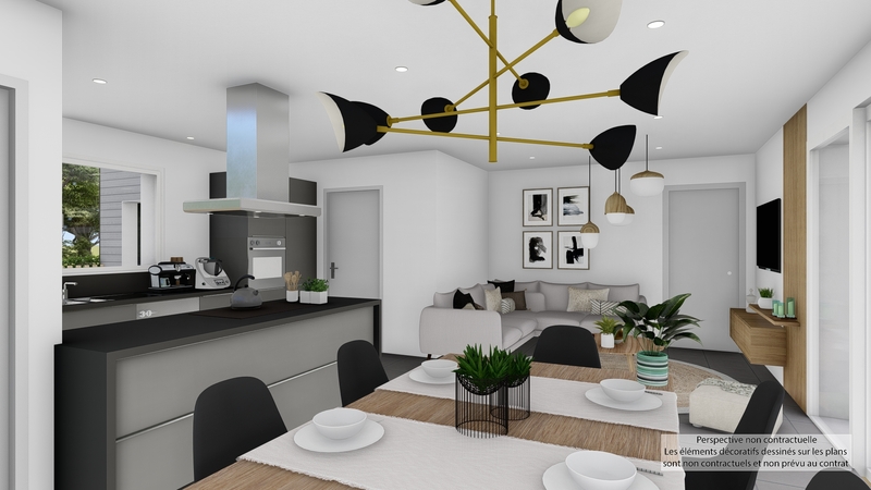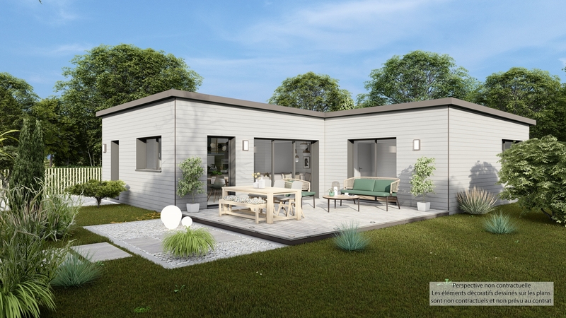 Maison design de plain-pied, écologique bas carbone et très basse consommation d'énergie à ossature bois et bardage bois. D'une surface habitable de 95 m², elle est composée d'une vaste pièce de vie lumineuse avec cuisine US, d'un cellier communiquant avec le garage, d'une entrée avec penderie, de 3 chambres, d'une salle de bain complète. Belles prestations comprenant menuiseires gris RAL 2900, PAC Air-air HITACHI Triple C, ventilation Healthbox 3.0 Hydro, 6 panneaux photovoltaïques avec revente, domotique, carrelage 60x60 et imitation parquet.