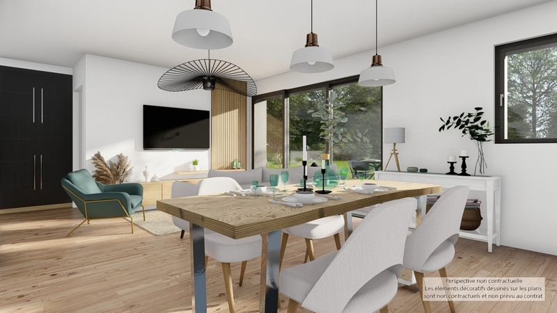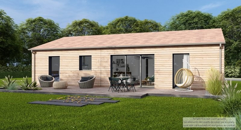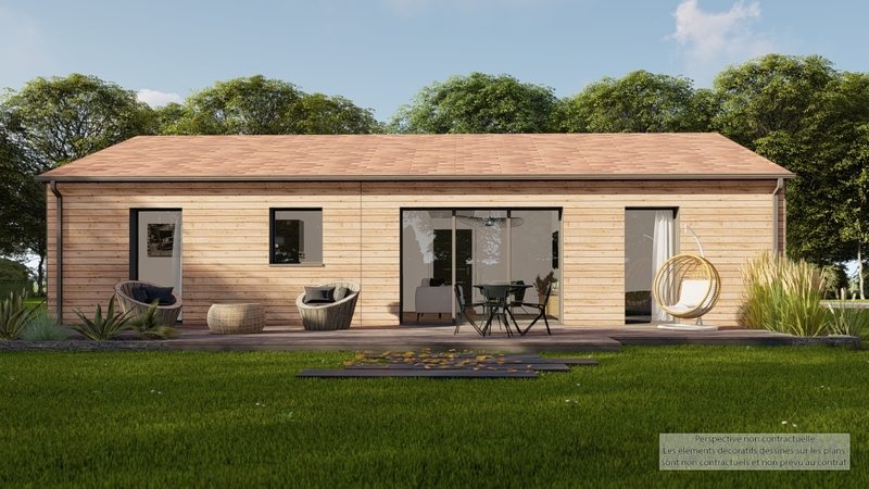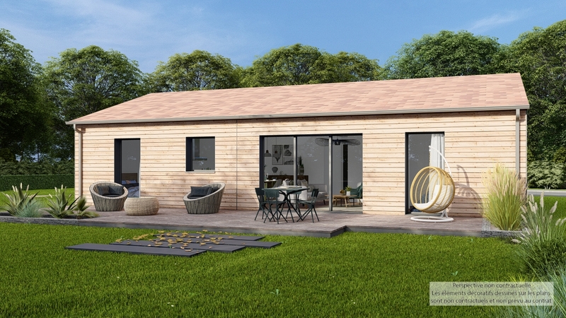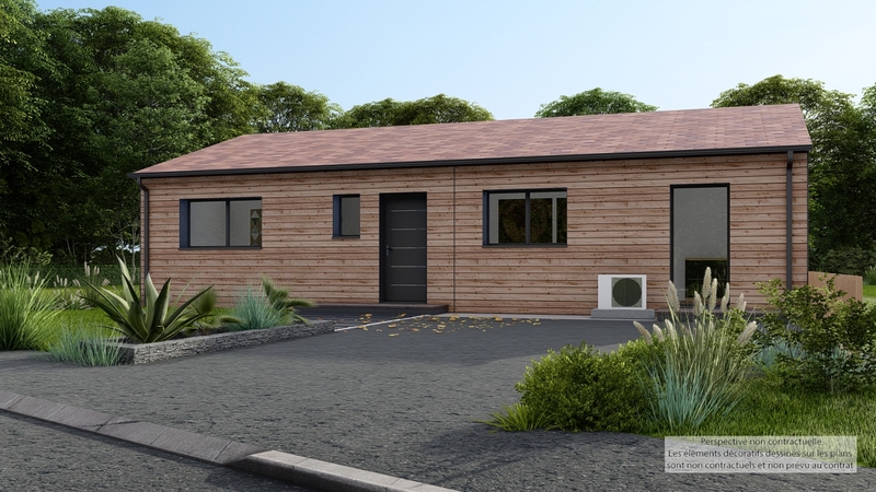 Maison design de plain-pied, écologique bas carbone et très basse consommation d'énergie à ossature bois et bardage bois. D'une surface habitable de 96 m², elle est composée d'une vaste pièce de vie lumineuse avec cuisine US, d'un cellier, d'une entrée avec penderie, de 4 chambres, de 2 salles d'eau et 2 WC indépendants. Belles prestations comprenant menuiseires gris RAL 2900, PAC Air-air HITACHI Triple C, ventilation Healthbox 3.0 Hydro, 6 panneaux photovoltaïques avec revente, domotique, carrelage 60x60 et imitation parquet.