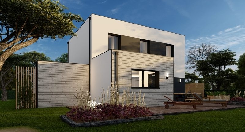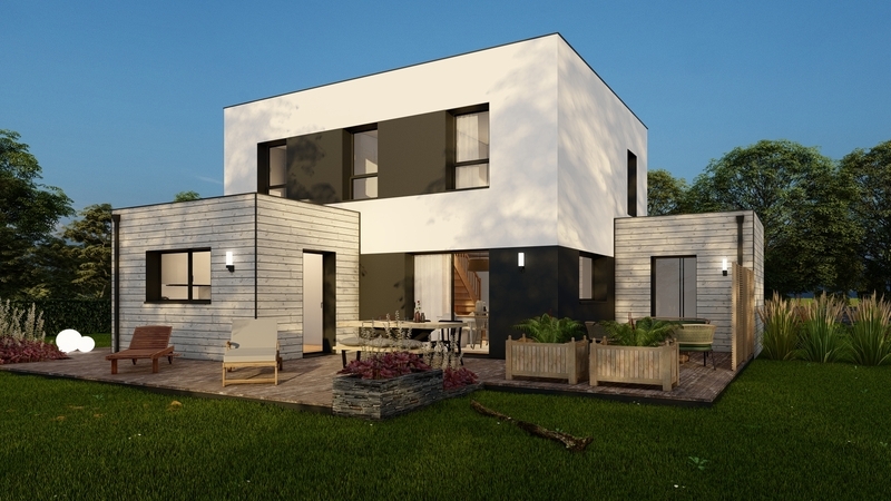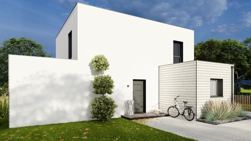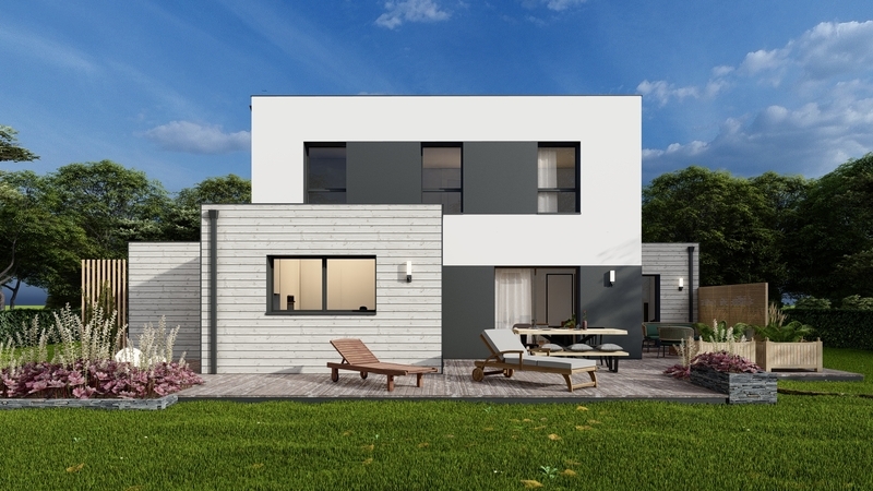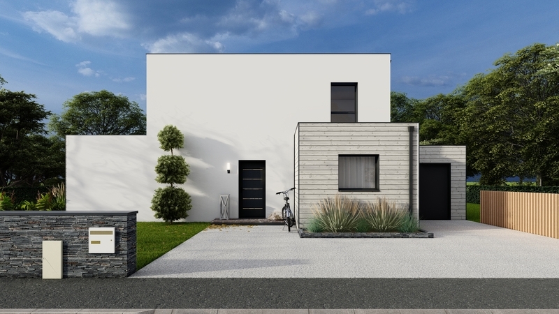 Maison contemporaine à étage partiel BAS CARBONE qui répond aux futures exigences environnementales: construction avec des matériaux biosourcés (consommation énergétique réduite à 30%), compris panneaux photovoltaïques sur toit plat et VMC connectée qui améliore la qualité de l'air intérieur. Au RDC, grande pièce de vie ensoleillée de 58 m² avec cuisine ouverte, cellier, suite parentale. À l'étage, 3 chambres, mezzanine, SDB, WC. Garage accolé, domotique, chauffage réversible. Béton de fondations décarboné, prise recharge véhicule électrique. Parties avec bardage bois épicéa gris.