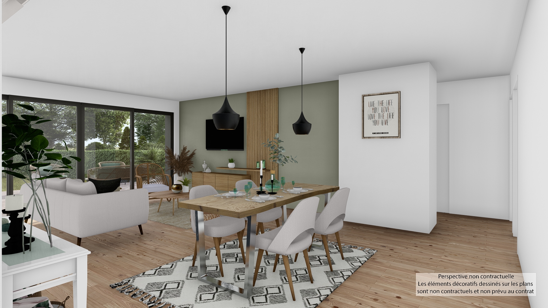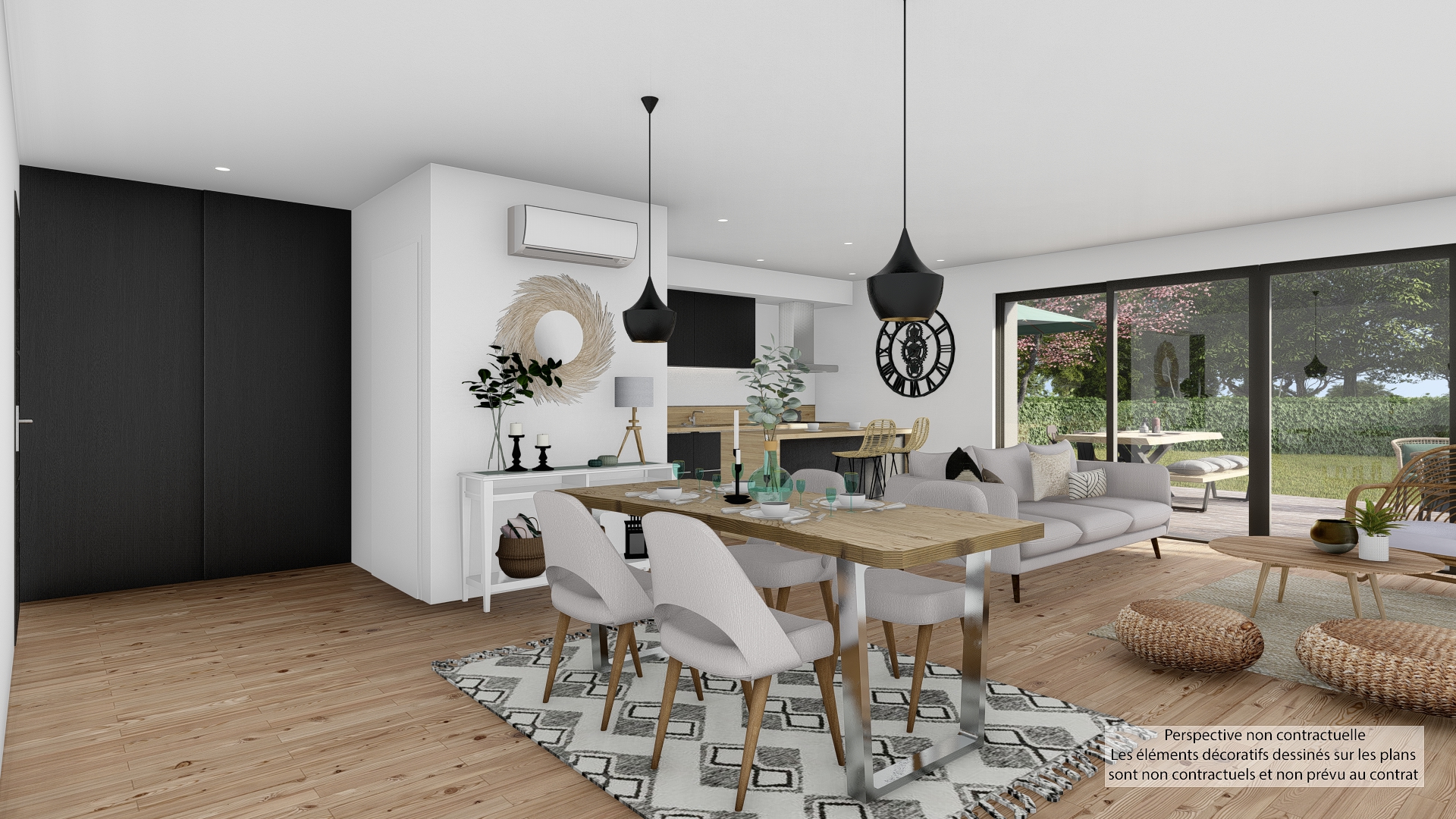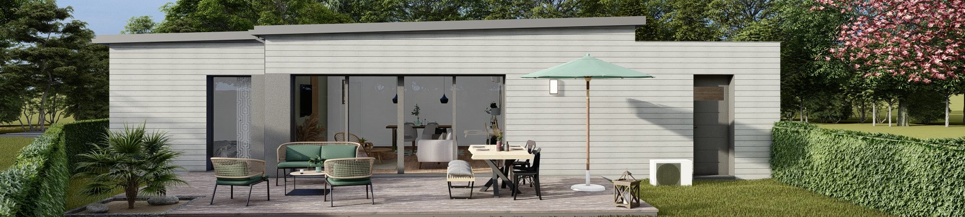 Maison de plain-pied en ossature bois basse consommation d'énergie et bas carbone avec toit monopente 3%, bardage bois Epicéa traité gris + panneaux décors en aluminium. D'une surface habitable de 92,26 m², cette maison est composée d'une grande pièce de vie lumineuse avec cuisine ouverte et cellier, entrée avec penderie et wc, d'une partie nuit avec 3 chambres, salle de bains complète, salle d'eau privative et garage de 22 m². Belles prestations: PAC Air-air multi-splits HITACHI triple C, carrelage imitation parquet, domotique, panneaux photovoltaïques avec revente.