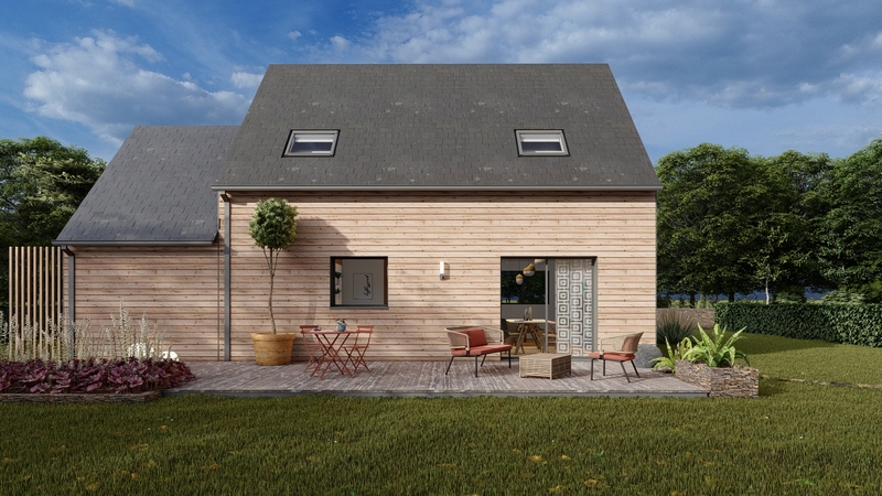 Découvrez cette maison de plain-pieds composée d'une pièce de vie avec cuisine ouverte. L'espace nuit se décline en 4 chambres, d'une salle de bains et d'un wc. Les équipes Trecobois sont à vos côtés pour imaginer la maison qui vous ressemble. En choisissant de faire construire une maison en bois, vous faites le choix d une construction durable et économique à plus d un titre. Rencontrons-nous pour échanger sur votre projet !