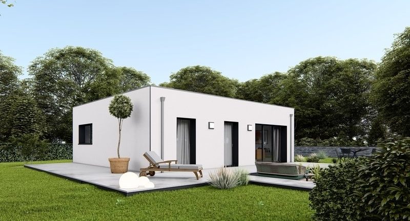 Ce plain pied moderne à toit plat, très bien pensé, sasn perte d'espace, dispose d'une pièce de vie avec cuisine ouverte comprenant une belle et grande baie vitrée 3 vantaux pour un apport de luminosité maximum et un mi,imum de consommation énergétique. La partire nuit quant à elle, bien distincte de la partie vie, se compose de 3 chambres, une salle de bain et un WC indépendant.