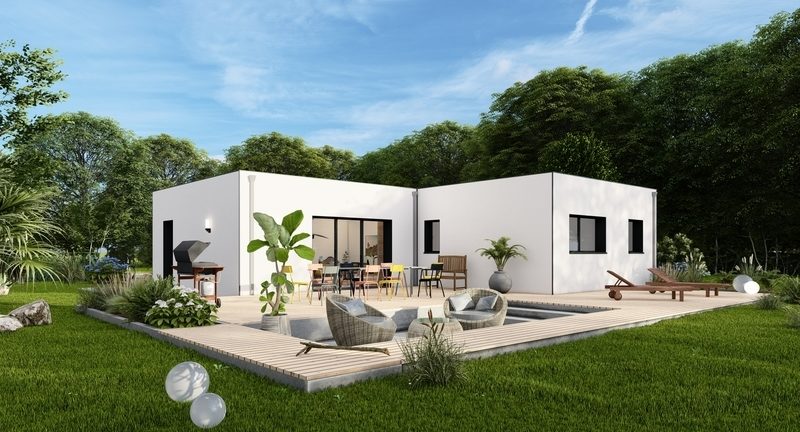 Ce plain pied moderne à toit plat, très bien pensé, sasn perte d'espace, dispose d'une pièce de vie avec cuisine ouverte comprenant une belle et grande baie vitrée 3 vantaux pour un apport de luminosité maximum et un mi,imum de consommation énergétique. La partire nuit quant à elle, bien distincte de la partie vie, se compose de 4 chambres, 2 salles de bain et un WC indépendant.