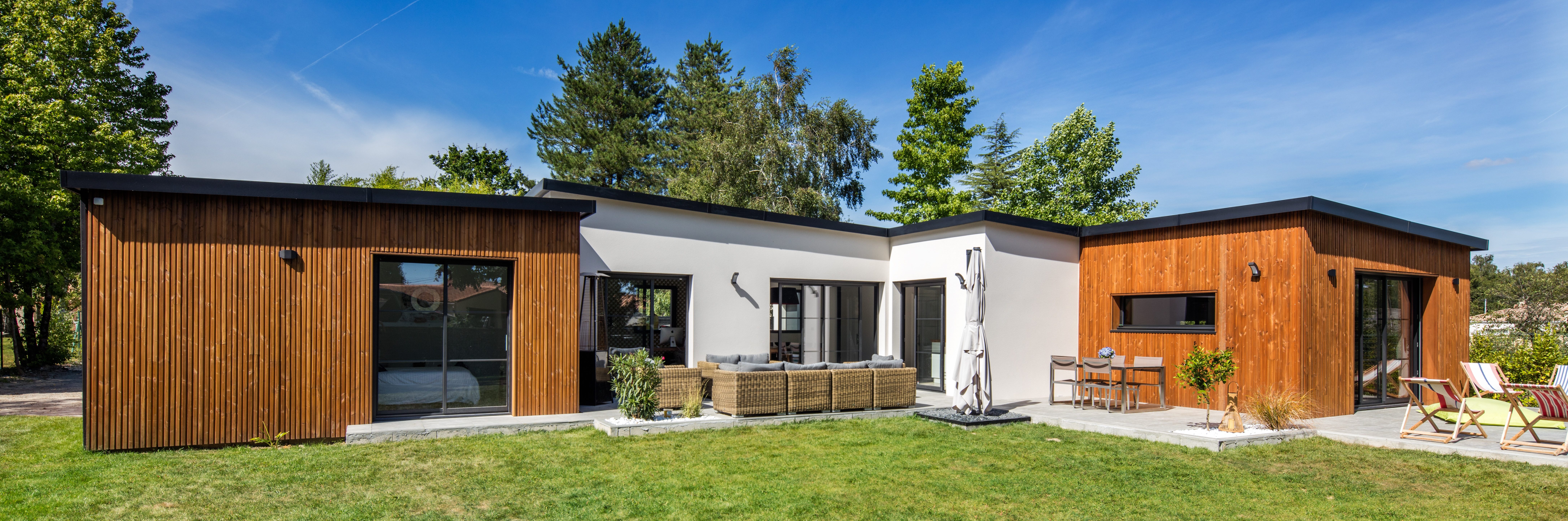 De style traditionnel ou contemporain, cubique ou non, adossée à un garage ou à un car-port, de plain-pied ou à étage, bardage clair, foncé ou naturel, enduit de couleur, toit pentu ou plat, en tuiles ou en ardoises… : avec le bois, tout est permis. Profitez-en et laissez libre cours à votre imagination !