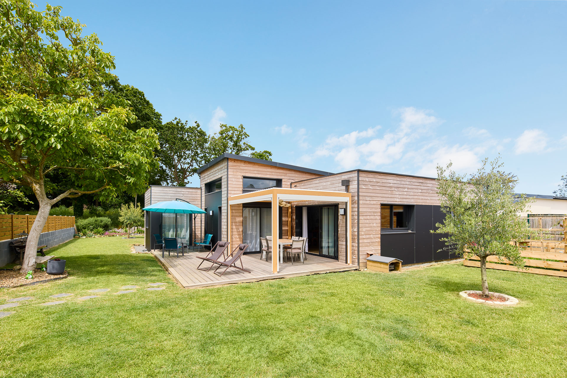 Votre maison bois mérite un écrin à sa hauteur. L’allée carrossable, le stationnement, la clôture en bois naturel harmonisée à votre architecture, le portail, la terrasse en bois (Douglas ou composite), l’éclairage extérieur et les plantations constituent autant de dépenses nécessaires. Prévoyez 10 à 15% du budget construction pour ces aménagements qui transforment votre terrain en véritable lieu de vie.
