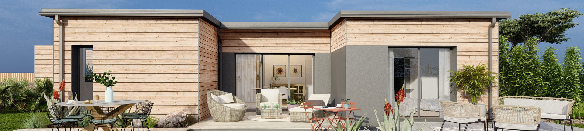 Cette maison bois se distingue par son architecture en U, qui permet de créer un espace de vie agréable, avec une terrasse au centre. Ce choix d’agencement optimise l’utilisation de l’espace extérieur, tout en offrant une vue imprenable depuis les pièces principales. La terrasse devient ainsi un lieu privilégié pour les moments conviviaux en famille ou entre amis, tout en préservant l’intimité de chaque côté de la maison. De plus, ce design favorise la circulation naturelle de l’air, contribuant ainsi à une meilleure ventilation et une sensation de bien-être en toute saison.