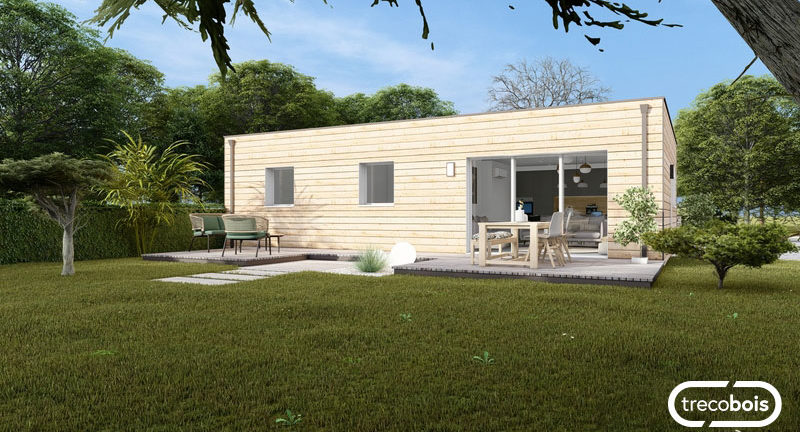 Ce plan de maison présenté par l’agence Trecobois, constructeur de maisons bois à Brest est une petite maison bois avec un toit plat en acrotère.