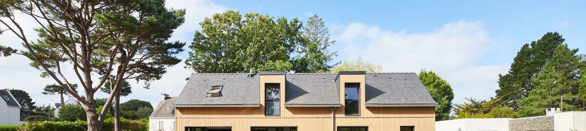 Le fait que la maison se trouve proche d’un bâtiment de France, quelques contraintes en matière de construction et d’architecture ont été imposée à Corine, la propriétaire de la maison. Le toit de la maison, un toit double pente ardoisé typique des constructions Bretonnes. Les gerbières, elles aussi rappellent ce style breton des années 50.