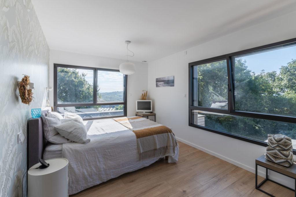 Dans les recoins plus intimes de cette maison, une atmosphère enchanteresse se dévoile. Les chambres, véritables havres de paix, se parent de motifs et de couleurs. Une chambre au rez-de-chaussée, baignée de lumière, offre une terrasse privative. Les propriétaires ont été inspirés par la nature en choisissant des meubles en bois, un luminaire en rotin tressé. Un bureau, niché dans l’intimité, révèle un cadre de concentration parfait.
