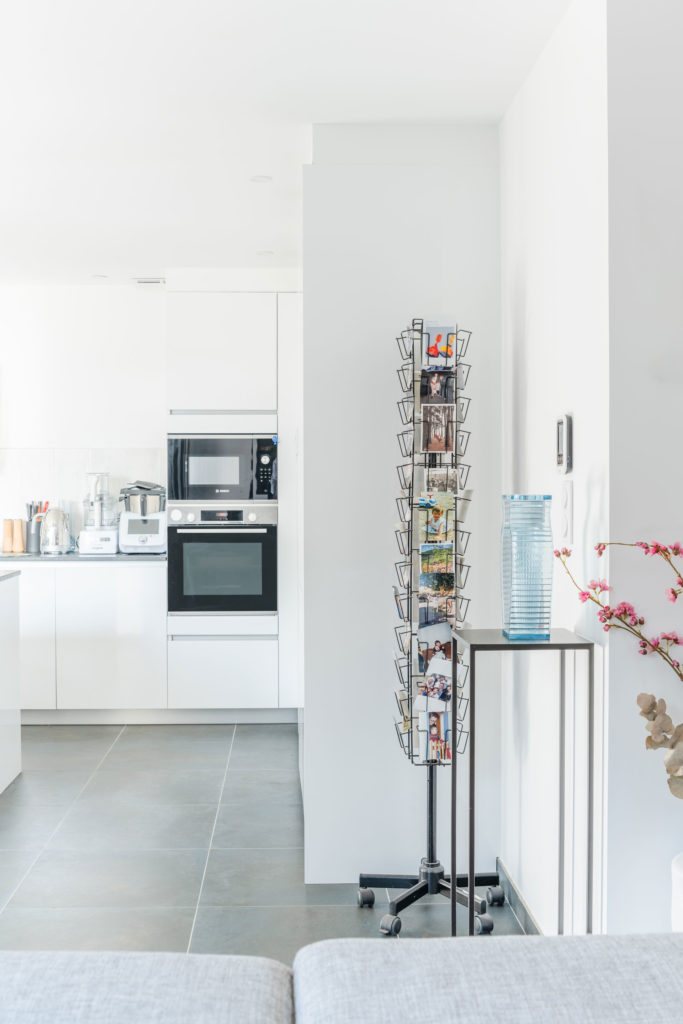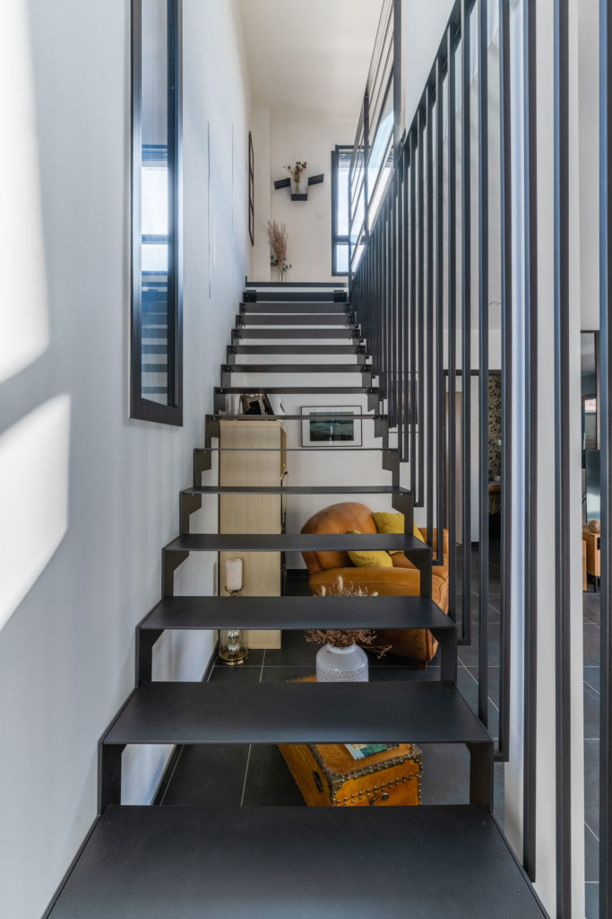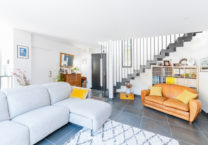 Les propriétaires ont souhaité profiter de chaque espace, bien que parfois difficile à aménager. Une bibliothèque en bois se niche sous l’escalier, abrite des livres et des BD pouvant être bouquinés dans le canapé.