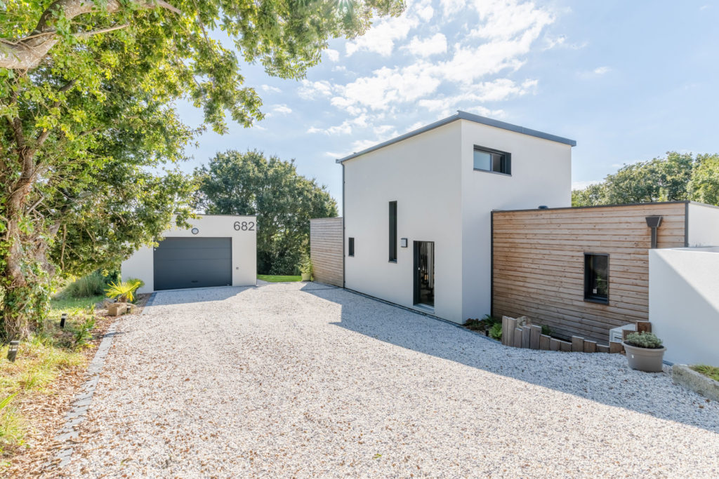 1, 2 et 3 rectangles assemblés forment cette vaste maison finistérienne. Son architecture originale fait sensation dès le premier coup d’œil. Au milieu, se situe le plus grand « bloc » qui se compose d’un rez-de-chaussée et d’un étage. Un enduit blanc recouvre cette façade.