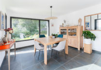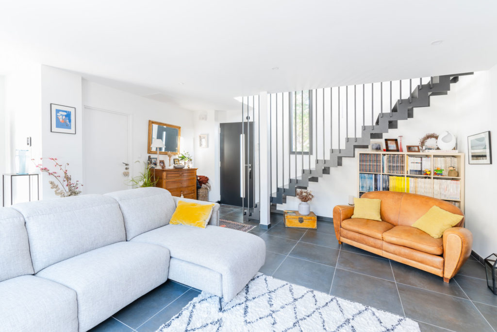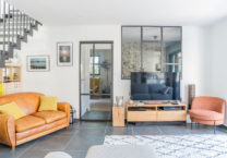 Le séjour, implanté au centre de la résidence, accueille un espace détente très lumineux. En effet, une grande baie vitrée aux finitions noir anthracite ouvre le salon à l’extérieur verdoyant. Un canapé gris clair, vient délimiter la pièce. Un fauteuil en Terracotta et un canapé en cuir marron viennent avec leurs rondeurs casser les lignes droites des autres éléments de décorations. Une verrière, se positionnant derrière la télévision, agrandit l’espace et insuffle une touche contemporaine.