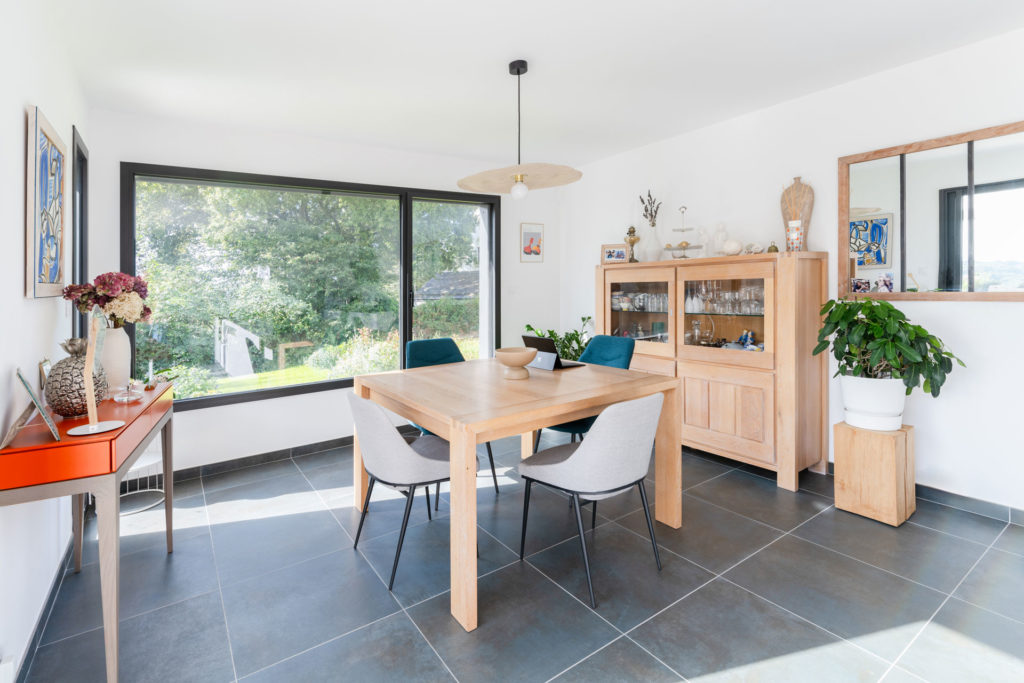 Comme dans la cuisine et le salon, le sol est vêtu d’un carrelage gris foncé. Il est souvent associé à une esthétique moderne et élégante. Moins salissant, il camoufle mieux les tâches et la saleté. Cela en fait un choix judicieux pour les zones à fort passage comme les pièces de vie, où la facilité d’entretien est un critère important.