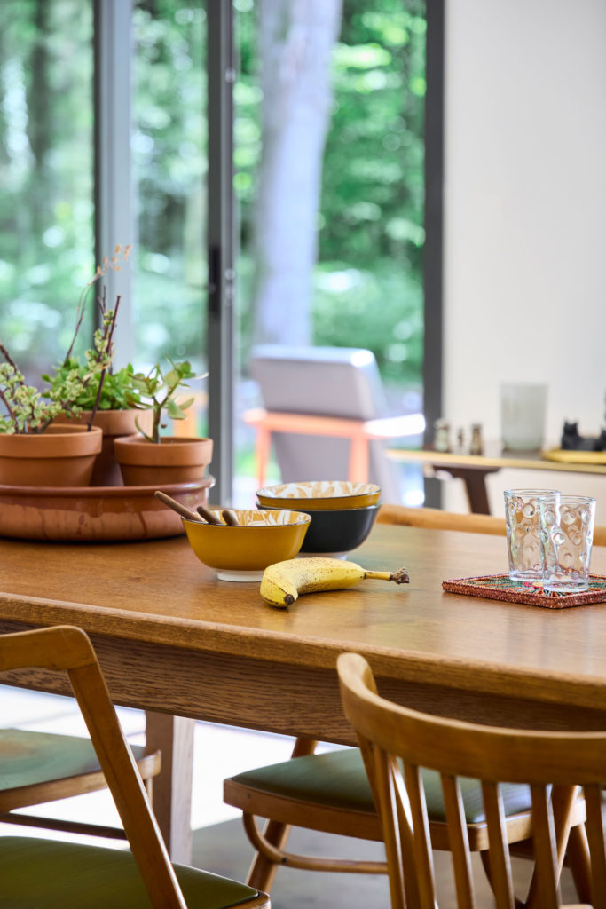 Si les espaces sont bien définis, côté décoration, les propriétaires ont opté pour une ambiance chaleureuse et naturelle qui se diffuse dans l’intégralité des pièces de la maison. Les différentes teintes de vert rappelant l’environnement extérieur sont omniprésentes au sein du logement :